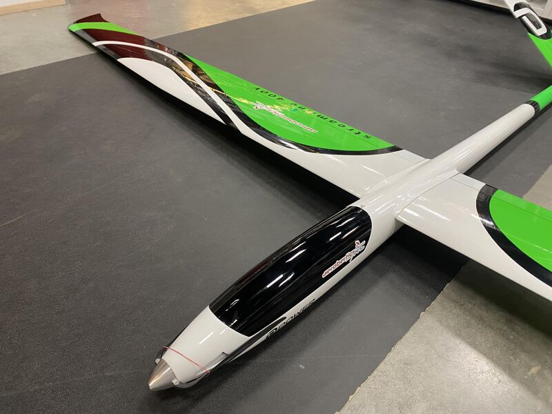 Das Segelflugzeug ist ein Vorführmodell, das nur ein paar Mal geflogen ist.