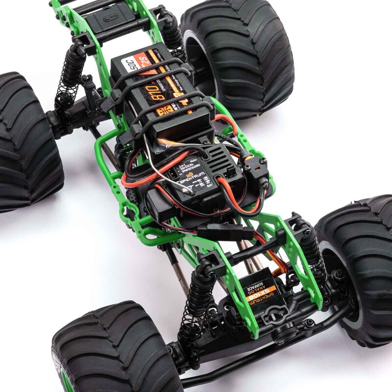 Losi Mini LMT 4WD monster truck comes factory-built and finished, with everything required for operation in the box — including a high-quality Spektrum SLT2 radio for interference-free 2.4GHz control, and a high-capacity Spektrum Smart LiPo battery and charger for long run times and effortless recharging.