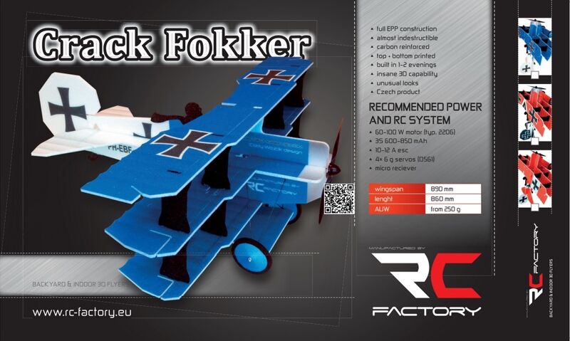 RC Factory & Twisted Hobbys have focused on selecting the correct matched electronics for the Crack Fokker which can be purchased separately on our web site. Recommended stock setup is a 2206 motor (kV 1400 - 1500), 2s 600 mAh GWS 9x5 setup or extreme setup is 3s 450 mAh - 450 mAh GWS 8x4. Enjoy the look of a classic Fokker Dr.1 with flight characteristics you have only dreamed of!