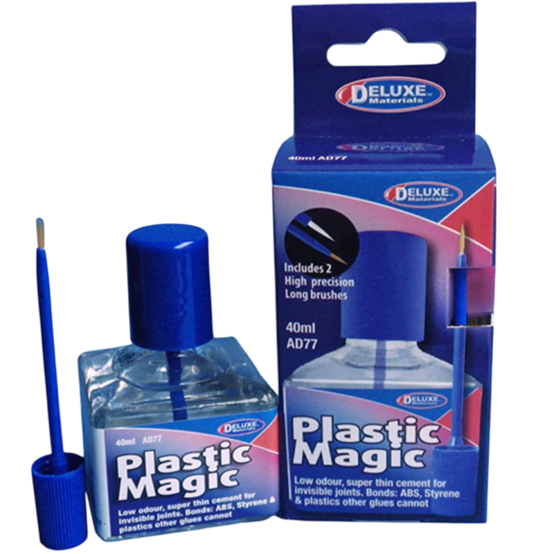 Plastic Magic can be applied using the Deluxe Materials Pin Flow solvent glue applicator (AC11) or conventionally with a fine paintbrush. It effectively bonds nearly all commonly used modelling plastics, including: