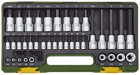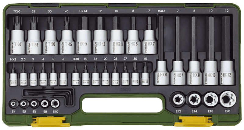 With 1/2" square drive (12.5mm) (for tightening torques from 25 - 210Nm): Screwdriver bits for Allen screws sizes 7 - 14mm (short version, 55mm) and sizes 6 - 12mm (long version, 100mm), for TX screws sizes 45 - 60 (short version) and for external TX sizes E12 to E20. Includes 5 angled Allen keys in 1.25 - 1.5 - 2.0 - 2.5 and 3.0mm.