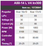 The main range of use is for sport and scale models from 2.2 kg to 6.0 kg, for aerobatic and 3D models up to 4.0 kg take-off weight. For electric and scale gliders from 7.0 kg to approx. 15.0 kg. The A50-V4 also fits perfectly in helicopter models of the 500/550 and 600 class.