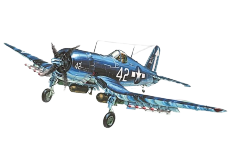 Nicknamed the “Sweetheart of Okinawa” by the U.S. Marines and “Whistling Death” by the Japanese, the Corsair performed effectively in two years- the Pacific conflict of World War 2 and the Korean engagement of the early 1950’s. The first production Corsair flew on June 25, 1942 at a time when the Japanese offensive seemed irresistible. It was not until late that year, with the delivery of the first Corsair squadrons into the hands of the U.S. Marines on Guadalcanal and the Solomon Islands, that the tide of air combat was permanently turned in favor of the Allied Forces. To the British Navy in the early 1944 goes credit for introducing the Corsair to carrier service. Nine months later, the U.S. Navy cleared the way for the Corsair to become the mainstay of its mighty carrier fleet.
