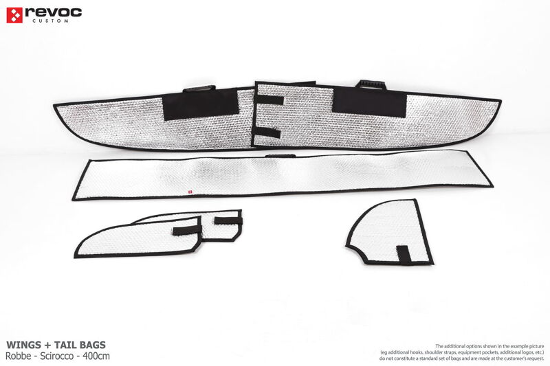 is a specialized protective cover set designed to safeguard the wings, stabs, and rudder of the Robbe Scirocco, a 4-meter model glider. Revoc is known for its high-quality, custom-made covers tailored to fit specific models and components, providing protection during transport and storage.
